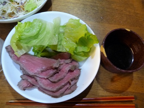 焼酎の水割りと(写っていません)ローストビーフ。右下にあるのがたれです。