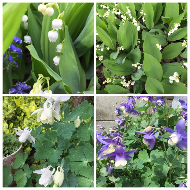 ウォーキング中 今シーズン初の すずらんとオダマキの花を見かけました。私も今シーズン初の麻のブラウスを着て歩きました。