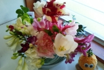元気の出るフラワーアレンジメントの前にいるのは多肉植物の「モスビー」。