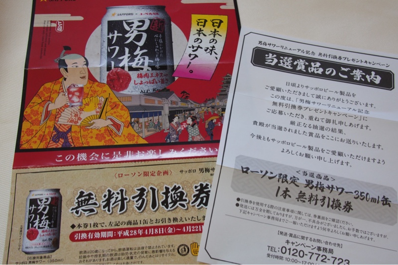 サッポロビールの男梅サワーが当選しました。ウォーキングから帰って来たら郵便受けに白い封筒があり 何が当たったのかなぁとドキドキしながら封筒を開けました。懸賞は たくさん応募しているので 今回の応募も忘れていました。嬉しいです。