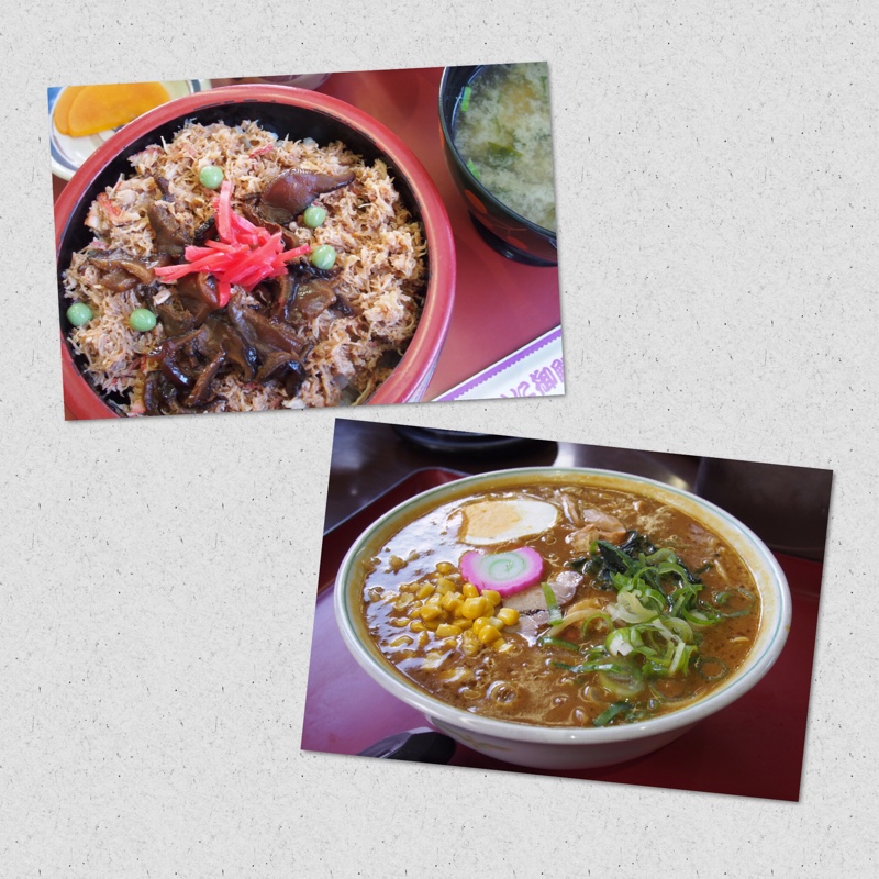 お昼ごはんは 登別温泉の隣町 白老町の蟹御殿でかにめしを食べました。主人は ホッキカレーラーメンです。かにめしは何種類かの かにのほぐし身が入っていていい味付けでした。980円は良心的な価格だと思いました。