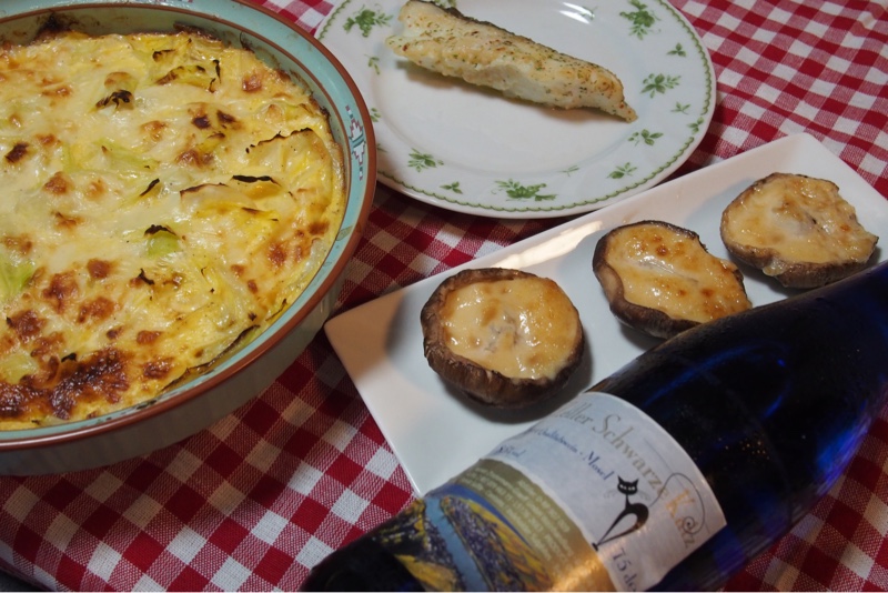 今晩の献立は 鱈のムニエル、キャベツのキッシュ、椎茸マヨネーズみそ焼きです。美容院の帰りに ドンキホーテで白ワインを買ってきました。昔よく飲んでいたシュワルツカッツがセール価格になっていました。甘口で飲みやすいワインです。今晩はこのワインをいただきます。