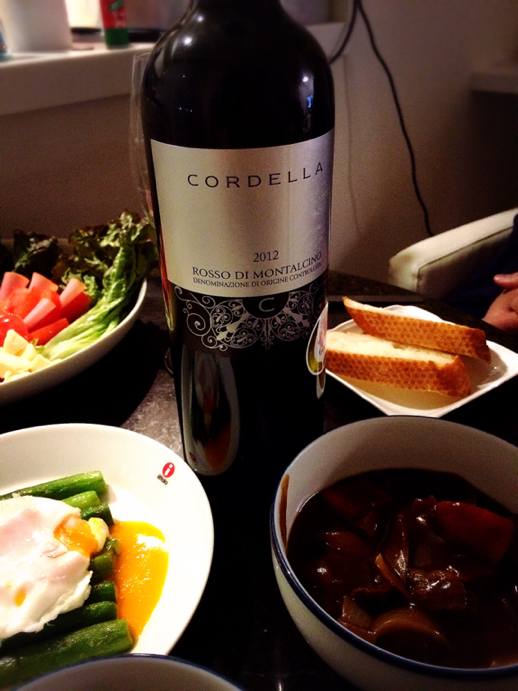モニター中のイタリア最高峰ワインのロッソ・ディ・モンタルチーノを本日いただきました(o^^o)バレンタインメニューでビーフシチューと、アスパラとポーチドエッグ、ハムとトマトのサラダ、バゲットです。