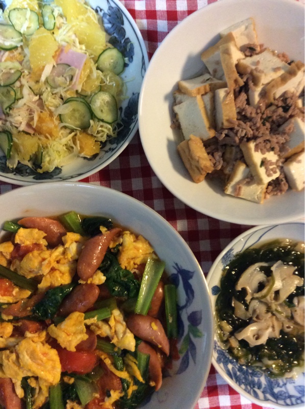 今晩の献立は ソーセージとトマトの卵炒め、厚揚げと挽肉の大葉みそ炒め、つぶの塩漬、キャベツときゅうりとハムと八朔と伊予柑のマリネです。今日みかんの詰め合わせが届いたので さっそく柑橘類を使ったマリネをつくりました。