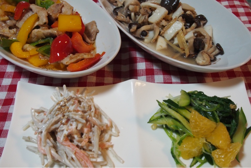 今晩の献立は パプリカと豚肉の辛みそ炒め、霜降りひらたけとイカの生姜炒め、三つ葉ときゅうりと八朔の和え物、ごぼうサラダです。今晩も野菜たっぷりです。