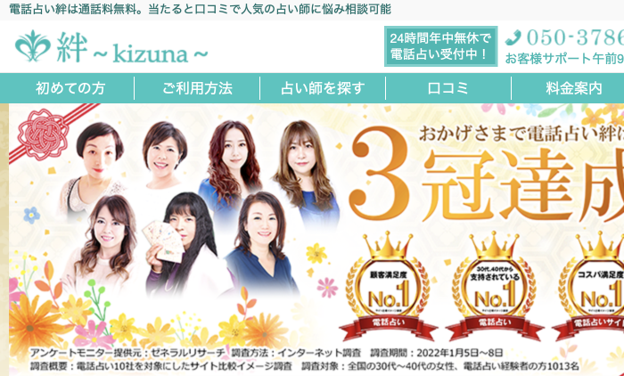 電話占い「絆~kizuna~」は、全国各地から選び抜かれたプロの占い師が、幅広い悩みに対して解決に向けたアドバイスを提供する占いサイトです。