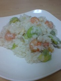 夕食に海老と空豆のリゾットを作りました。写真は彼が食べた分。私はお茶碗に1杯だけ食べました。リゾットや雑炊ってご飯が水を吸って少ない量でもボリュームが出るからダイエット中にぴったり。1本飲みたいビールも半分にしといたし、今日はがんばった(^^)