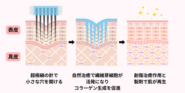 アプローチ極細針で微細な孔をあけ創傷治癒反応でコラーゲンの産生を促すレーザー光の熱エネルギーで肌に傷をつけコラーゲンの産生を促す
