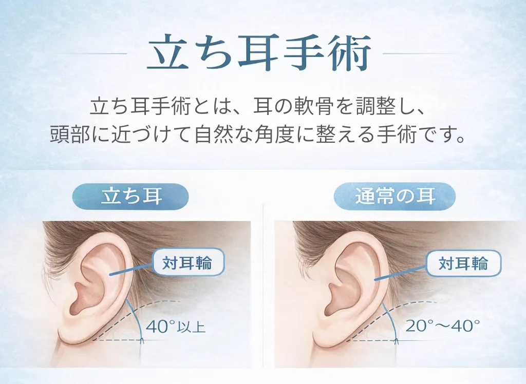 立ち耳手術(耳介形成術/Otoplasty)は、耳介軟骨を調整して耳を頭部に近づけ、自然な角度(耳介側頭角15〜25度)に整える手術です。