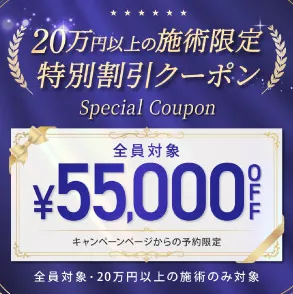 | 初めて来院した方が対象 初回施術で25,000円OFF 全施術対応 | リピーターの方が対象 初回はどの施術でも1万円、 2回目以降5万円以上の 施術で1万円引き | 20万円以上の施術を受ける 全患者さん対象 高額施術で諦めていた方へ | 症例モデルに協力 可能な方対象 症例モデル契約で全施術適応 |