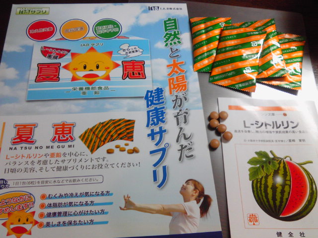 夏恵が届いたので試してみました。写真の通り、これまで自分で試してきたサプリメントと比べると、よく言えば色が自然、悪く言えばちょっと心配な色でした。1日6粒で、えっと思いましたが、特に飲みにくくはありませんでした。効果は、これだけ飲んだだけではちょっとわかりませんでした。続けて飲まないとだめなのかな?L−シトルリンというスイカやゴーヤに含まれる成分が配合されているとのことで、血流改善や精力の増強、美肌効果があるとのことなので、サンプルがなくなるまでしっかり試してみます。