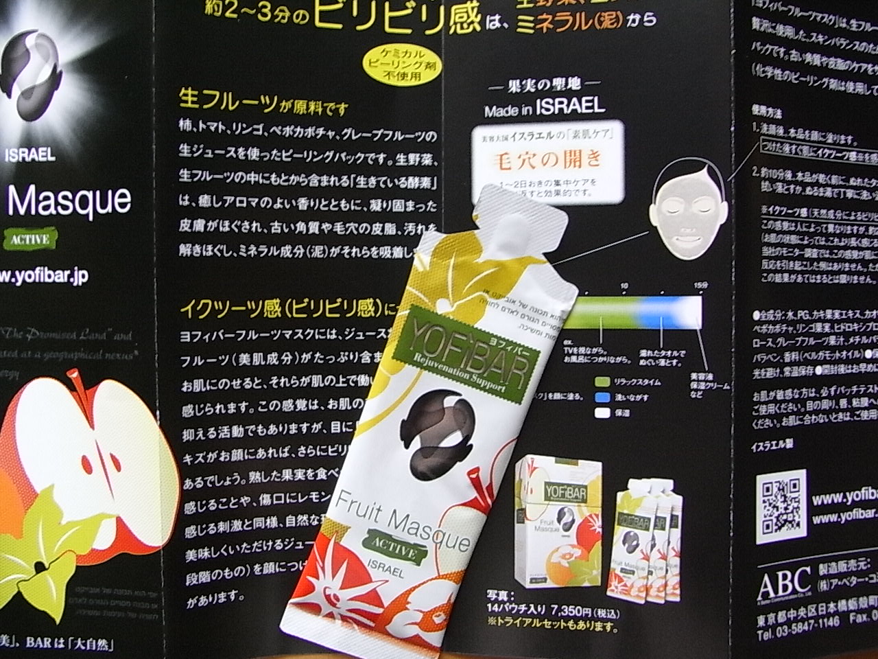 ヨフィバーフルーツマスクはイスラエル産で生フルーツと泥のピーリングです。 フルーツに含まれる酵素が肌にとても良いというのを知っていたので、とても期待できそうです! 市販されている多くのピーリング剤には化学性ピーリング剤を使っていて効果はあるけど、怖いと思って手を出さないでいましたが、このピーリングはそのようなケミカルピーリング剤は使用していないので安心できます! やわらかなつけ心地で、その後1〜2分ピリピリヒリヒリ感が続きます。それを我慢できればその後はヒンヤリとアロマの香りとともにリラックス〜...