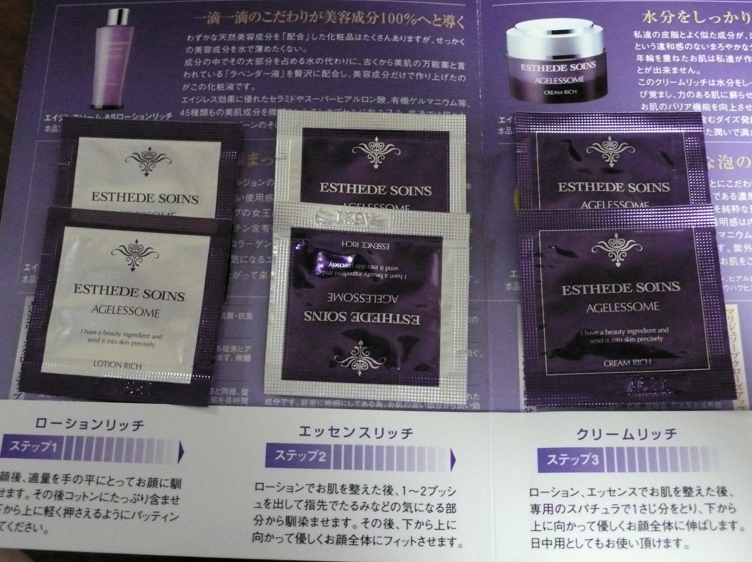 2回分でしたが、とってもしっとりして、今までにない化粧品だということがわかりました。 ローションリッチは香りが良く、濃厚です。すぐに浸透していく感じがします。 エッセンスリッチは伸びが良く、少しの量でたくさん塗ったような感じがします。 クリームリッチは肌がなめらかになります。 高めの価格も納得できるような化粧品だと思いました。
