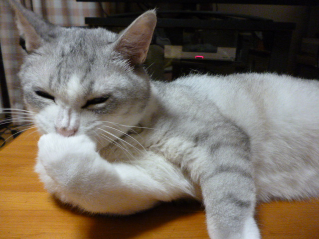 猫は晩ごはんが終ると、机の上に上がって過ごすことが多いです。