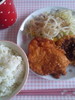 五穀米、フライドチキン、コロッケ、もやしとキャベツのサラダ