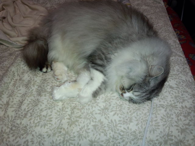 猫は、ベッドの上で、気持ち良さそうに寝ています♥