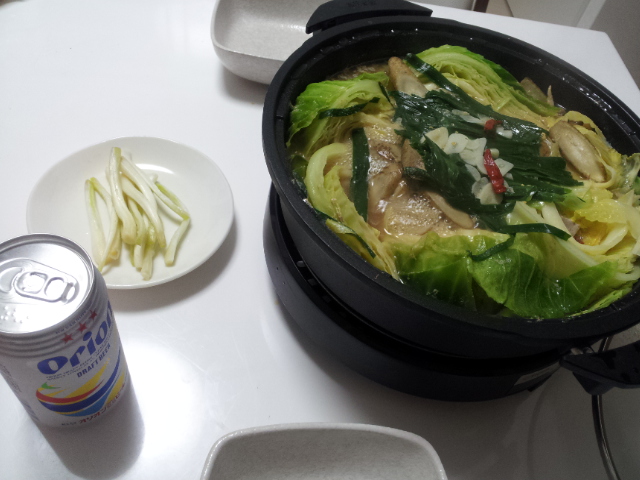 今日はモツ鍋と島らっきょうの塩漬けとオリオンビールでした〜(^o^)/