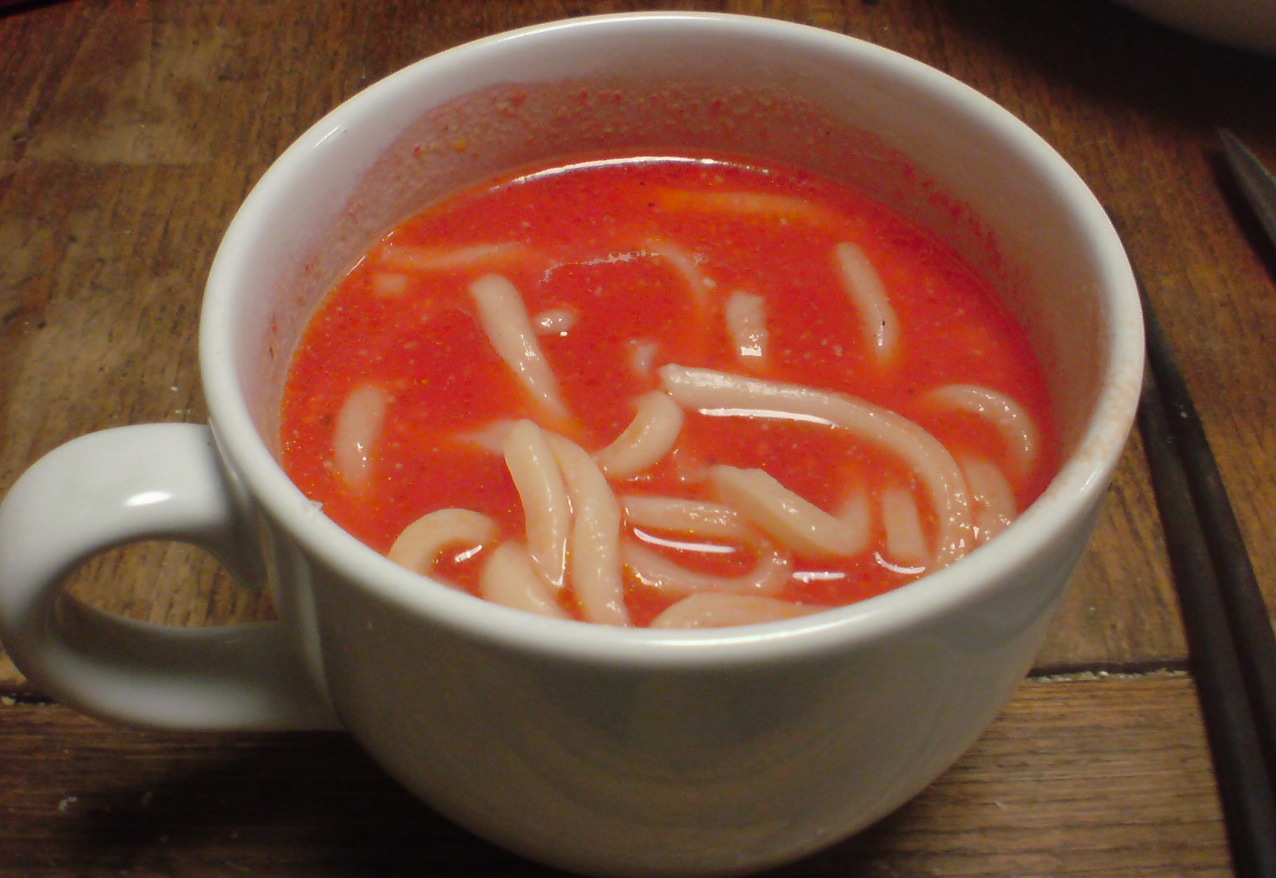 今日のランチはトマトジューススープに冷凍うどんと胡椒と粉チーズ入れただけ。ひどすぎ…!?