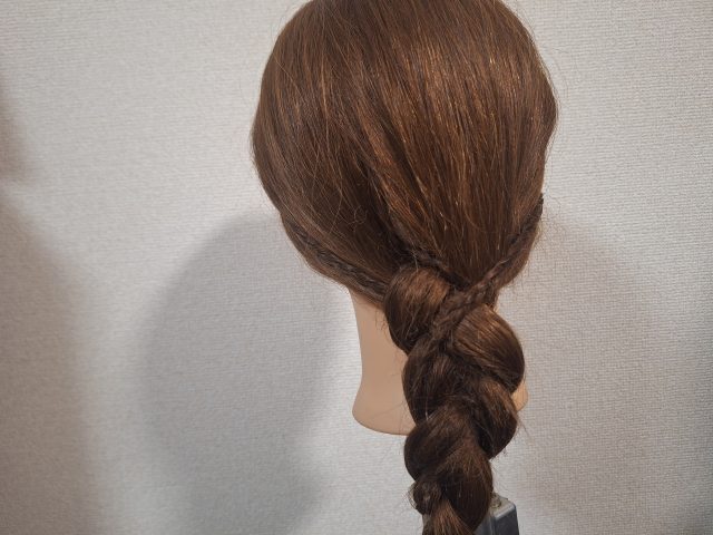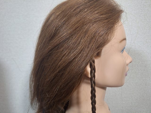 ⑵反対側は耳辺りで髪を少し取り、同様にきつめのみつあみにしましょう。