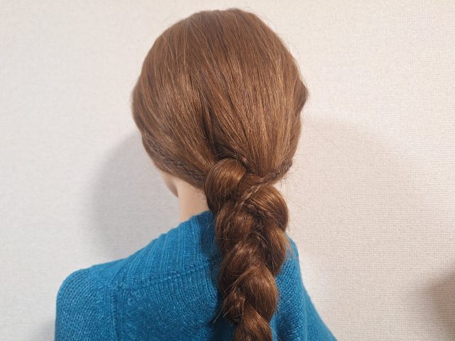 ⑶髪をうしろでまとめて、みつあみにしたら完成です。
