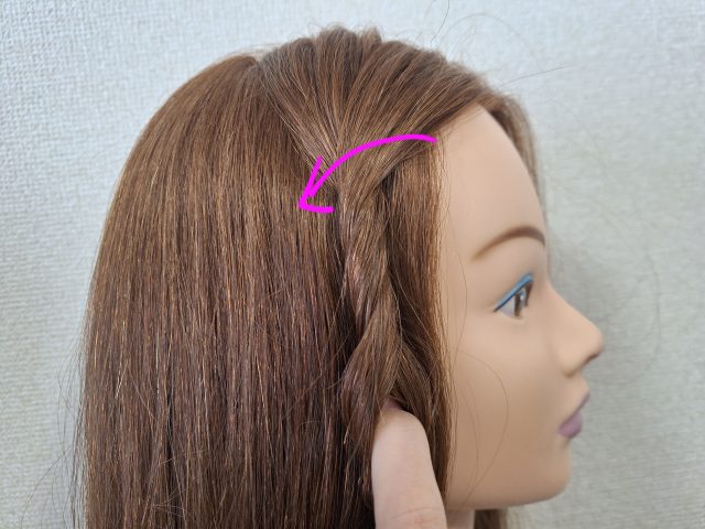 ⑷指を入れたまま、耳前の毛束をつかみます。