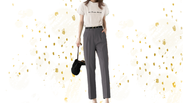 このようにセンタープレスの入ったキレイめなボトムスと合わせれば上品なコーディネートに! 通勤やお出かけにもぴったりのコーデになりますよね。