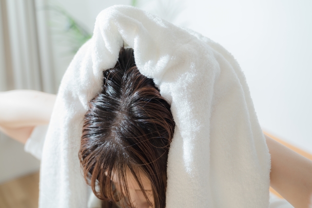 シャンプー後の髪を拭くときにはタオルで擦らず、優しく押さえるようにして水分を取りましょう。