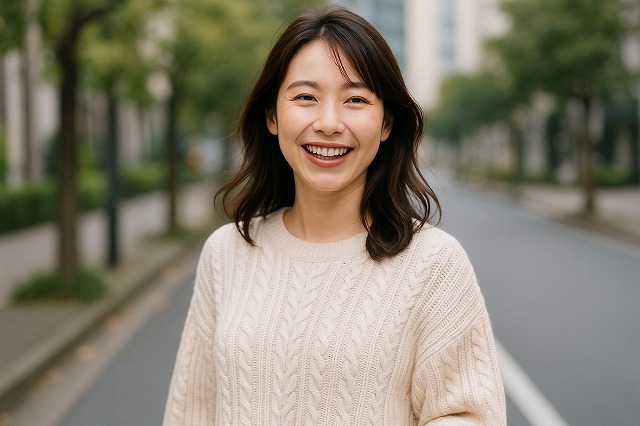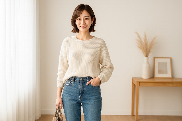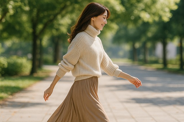 厚手ニットを着てもスッキリ見える人は、体を隠しているのではなく、見せるバランスを知っています。どんな体型でも、「首・手首・足首」を見せることで軽さが生まれ、印象が変わります。