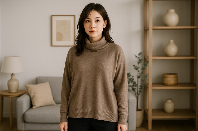 タートルネックを選ぶなら、やわらかい素材で「ゆるく首に沿うタイプ」を。ボリュームのあるハイネックは、髪をまとめて首を見せるだけでぐっと軽やかに。