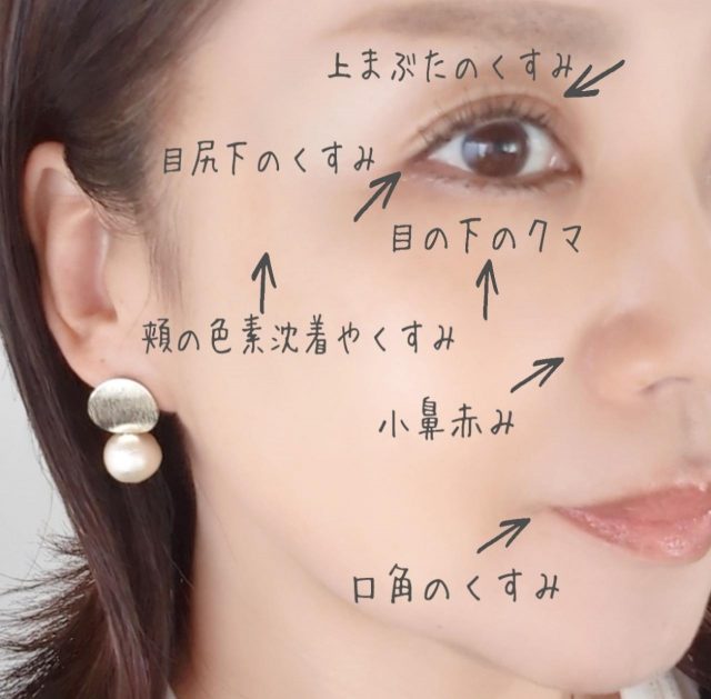 ◇上まぶたのくすみ ◇目尻下のくすみ ◇頬付近の色素沈着やくすみ ◇目の下のクマ ◇小鼻の赤み ◇口角のくすみ など。