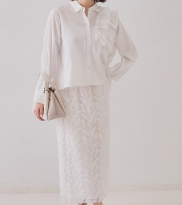 透明感と抜け感、フェミニンな印象にまるごとフォーカスできる、白シャツ×レーススカートの組み合わせ。