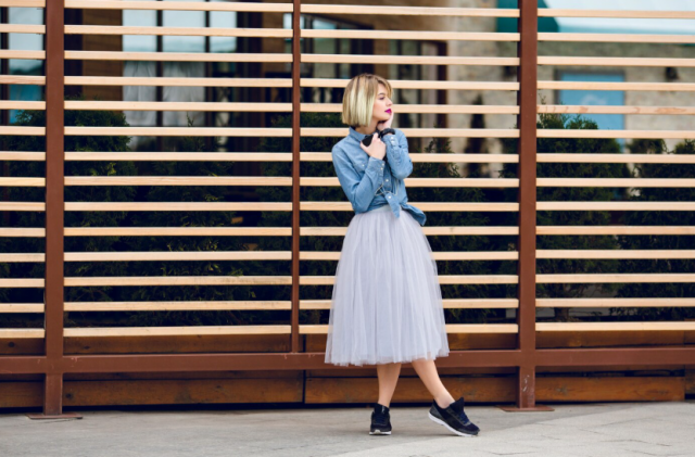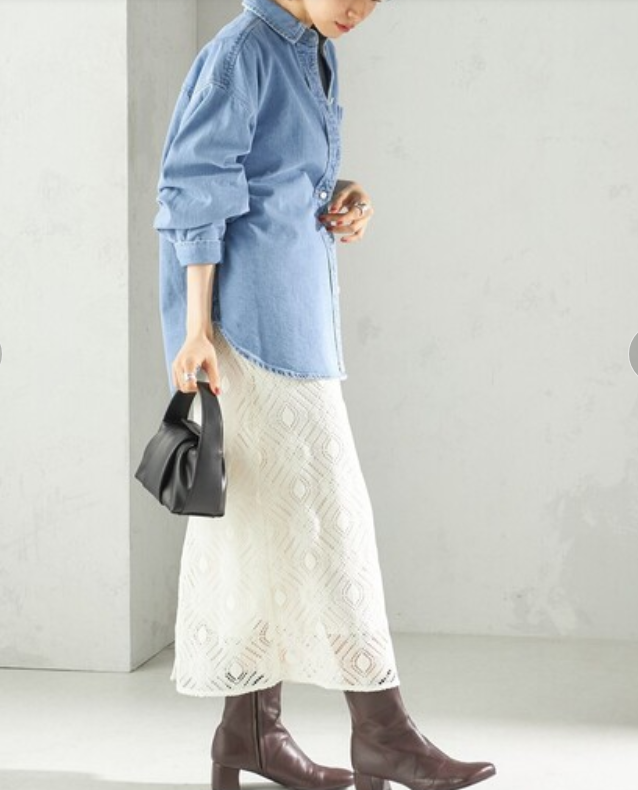 レーススカートの上品さとデニムシャツのカジュアルさが、程よい抜け感を与えてくれて、キレイめなのにカジュアルなバランスの良いコーデに仕上げてくれます。