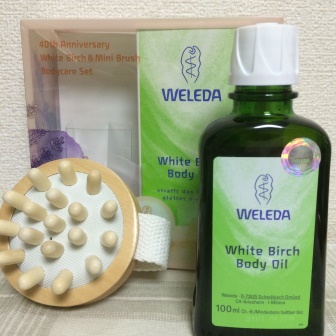 ホワイトバーチオイル現品にマッサージブラシが付いているので贈り物にもぴったり!私自身、毎日せっせとホワイトバーチオイルでマッサージして、セルライト撲滅目指してます。