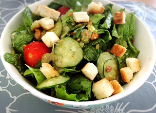 本日も山盛りサラダ!息子のパンからカットしたパンの耳をカリカリに焼いてクルトン代わりに♪