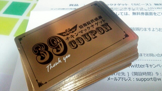 39枚のナゲット無料券!!ありがたやありがたやです(゚∀゚)