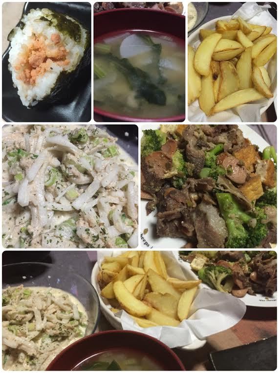 #オニギリ #大根ツナサラダ #おみそ汁 #フライドポテト #晩飯 #おうちごはん #オリーブ炒め #豚肉 #ブロッコリー #ウインナー