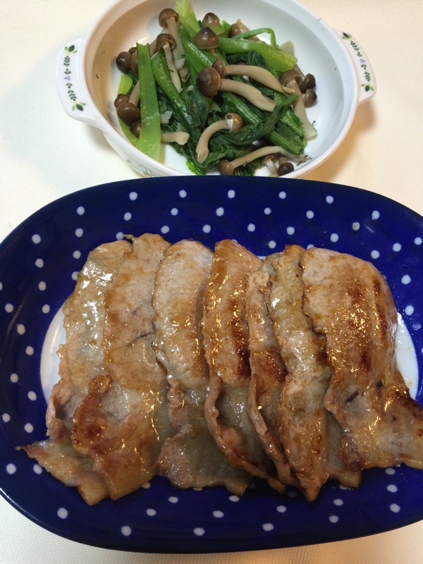 夕食は 北海道名寄産 ひまわり畑ポーク ロース肉(240g)の生姜焼きと小松菜としめじのレンジ蒸しです。今朝の体重は100gだけ減りました。今晩もMEC食 ご飯なしの お肉たっぷりの カムカム30です。