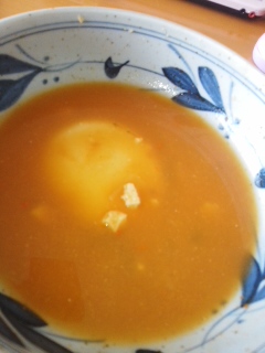 カップに入れてお湯注いで飲むスープを鍋に入れてお餅入れたら、たっぷりボリュームの昼ごはん!