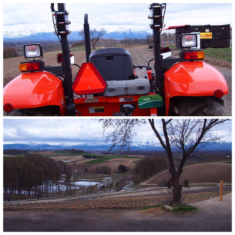 美瑛 四季彩の丘の風景です。花はこれからですが、残雪の十勝岳連峰がきれいです。