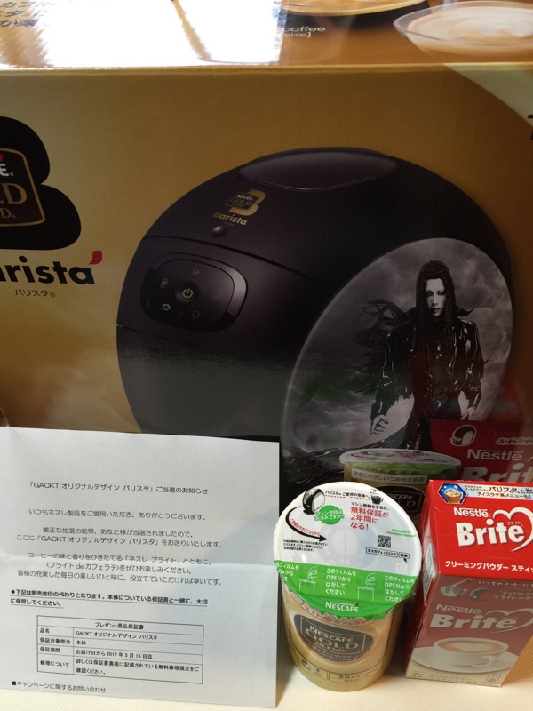 ネスカフェ GACKTオリジナルデザインバリスタ 当選しました。カプチーノ カフェラテなどの五種類のコーヒーメニューを楽しめます。お手入れは水洗いだけでOKです。いつも レギュラーコーヒーを飲んでいますが、さっそく新しいコーヒーを試してみたいと思います。