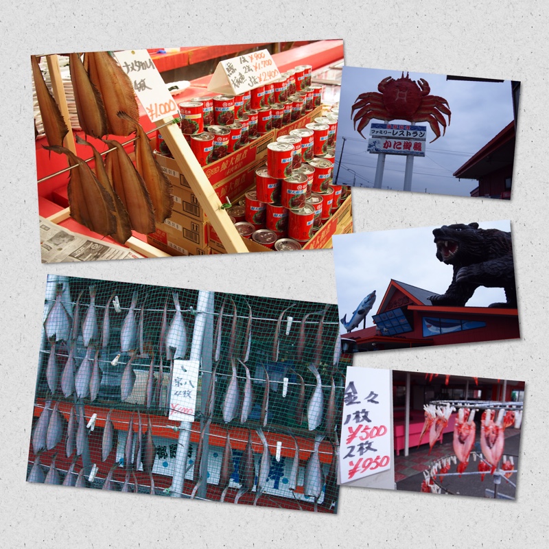 登別温泉の隣町の白老町 かに御殿で魚の干し物が売られていました。中華系の観光客が興味深げに見ていました。