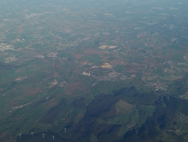 上空から見るとたくさんの風力発電と家々の屋根に太陽光発電があるドイツ