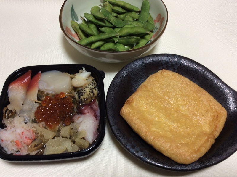 今晩のお酒のおつまみは 海鮮漬け、油揚げ、枝豆です。昨日の豚肉の角煮など おかずが残っているので簡単なメニューになりました。喉からからでドライブから帰ってきました。ビールで乾杯します。