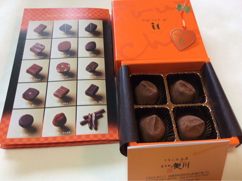 デパートでチョコレートを買ってきました。写真は自分用で 何種類か試食してとても美味しかった京都のチョコレートを買いました。主人には同じく試食して甲乙つけがたく美味しかったオリジンーヌ・カカオボンボンショコラの詰め合わせを選びました。試食をたくさんして口の中が甘く感じます。