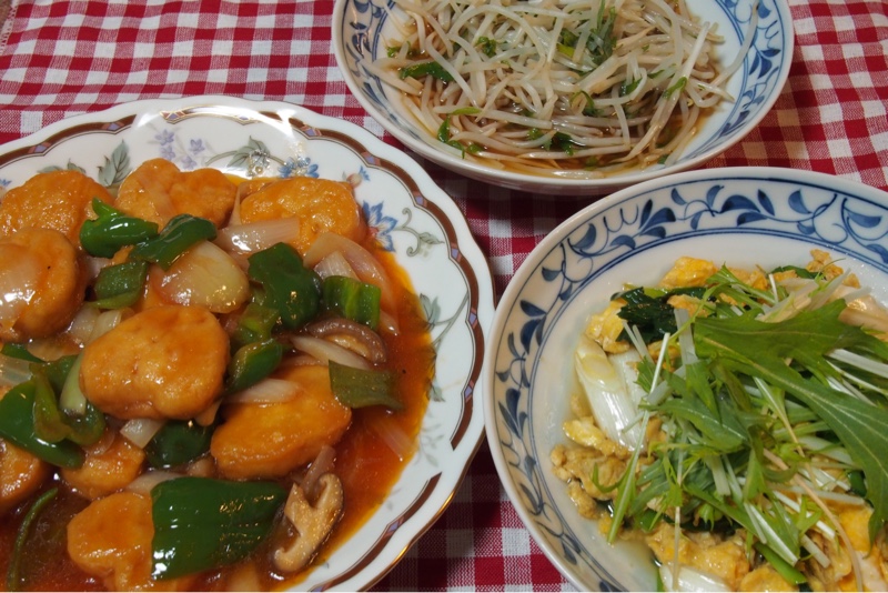 今晩の献立は チキンナゲットの酢豚風、ニラと卵のオイスターソース炒め、もやしと大葉の和え物です。中華料理は野菜がたくさん食べられるので大好きです。ボリュームがあるのもいいですね。