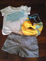 黄色のビキニ、白のウェア、ヒッコリーのショートパンツが