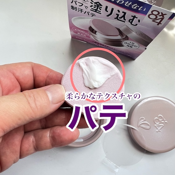 8x4からいただきました パフを使って 直接制汗デオドラント剤を気になるところに塗り込め しかも テクスチャがとても柔らかいので 毛穴の中まできちんとパテを塗り込めます。 塗ったあとの肌を触ってみると やばいくらいサラサラしてて 汗じみも出来づらかった気がします。 ただ私的にはパフの衛生面がちょっと気になりました。