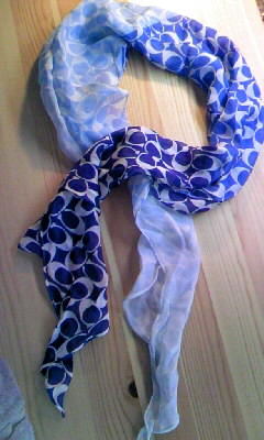 首に巻くものが大好きなので、冬はマフラー、春はスカーフをよく使います。 このスカーフは青のグラデーションがきれいで、どの色を一番目立つ位置に持ってくるかで印象が変わるのが使いやすいポイント。 春だけど今日はちょっと肌寒いな、というときに重宝します。