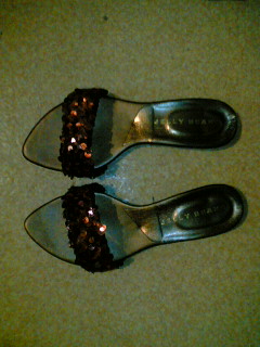 バーゲンの戦利品第2弾です。 ヒールが低くて疲れないのとスパンコールのキラキラが気に入って買いました。 写真だと分かりづらいけど、スパンコールが全面に満遍なく縫い付けてあるので夜でもキラキラしてます♪ ジーンズでもスカートでも合います。 唯一残念なのはヒールがすり減ってビーサンくらいに平らになっちゃったことです。 私がヒールを引きずって歩く癖があるからいけないんだろうけど(^^;