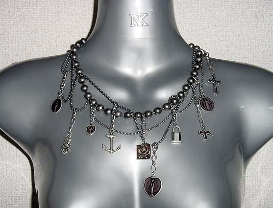 お気に入りファッションアイテムです。 これはゴルチエで売っていたチャームを自分でチョーカーにアレンジしたものです。 (チェーン部分が輪になっていたので、外してチョーカーパーツをつけました) 重くてジャラジャラしてカッコいいですよ♪